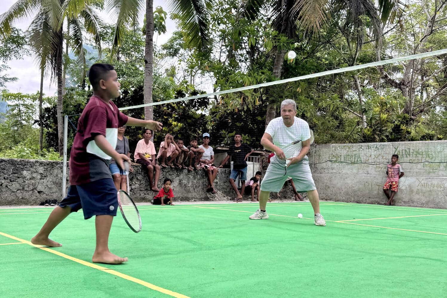 In ruil voor plastic, meegenomen van huis, schoon en droog krijgen de kinderen badminton les van oom Daniele Tahitu uit Nederland. Hij is enthousiast badminton coach en ook enthousiast over het programma van Happy Green Islands.